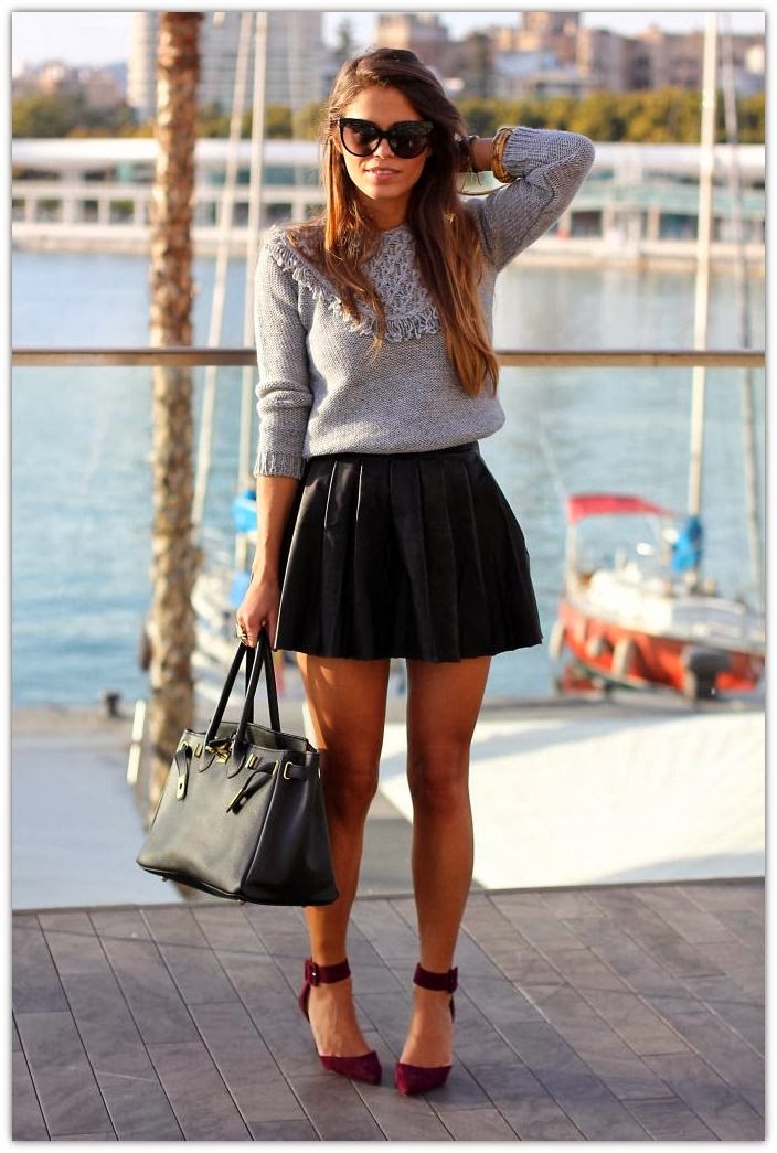 Кожаная юбка солнце — один из самых эффектных и стильных предметов гардероба. У такой модели есть неоспоримые преимущества. Во-первых, она отлично держит форму, не мнется и не пачкается. Во-вторых, юбка солнце из кожи довольно тяжелая и не поднимается от каждого порыва ветра, как ее легкие и воздушные «подруги». Выбирая, с чем носить кожаную юбку солнце, стоит обратить внимание на неброский и скромный верх. Естественным образом в сторону откладываются другие кожаные вещи — жилеты и куртки.